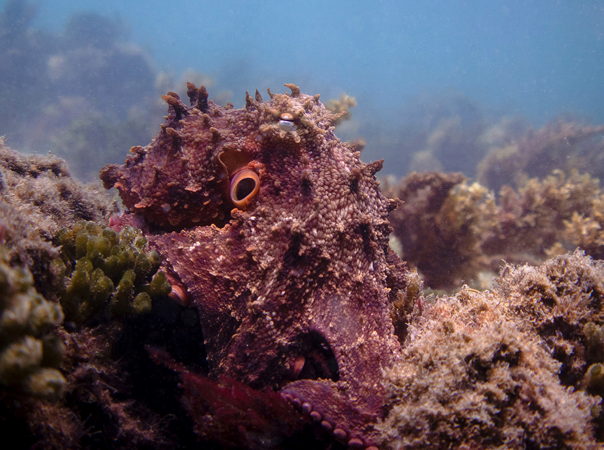A few photographs of a great octopus, taken yesterday at Fly Point (Australia) – in the shallows at the end of the dive, in dappled glare, and with sand, weed, and everything else flying round. I came across her in the open, and she roamed a bit and then headed back to a cavity in some rocks that might have been her den. I moved my hand towards her (no glove) and after some cautious arm-tip-roaming she took hold of it, felt, and then pulled. A lot of strength, as always. It was the first time I’d felt that velvet-muscle octopus-arm combination in a while – such a pleasure. The first since the Jervis dives nearly a year ago, perhaps. When I persisted a little, she left the den and hung around on top of it – the top photo – and then wandered into some surrounding weed. Then back home. I reached out a second time and again she tried to haul me into her den. I didn’t want to stress her – when they leave the den after one persists in interacting, I suspect that is not what they’d ideally like to be doing. There were no visible signs of stress, but when I reached a hand forward another time, her preferences were made clear with several jets of water. So I said goodbye.