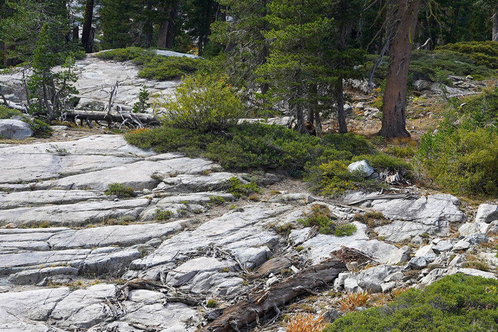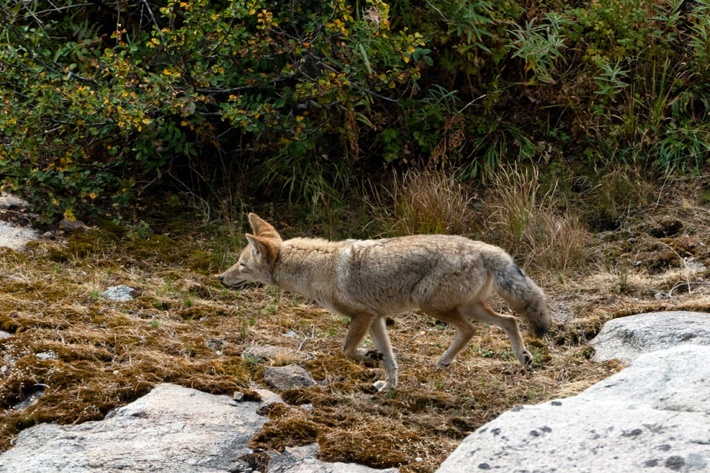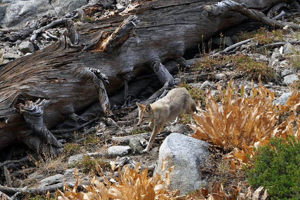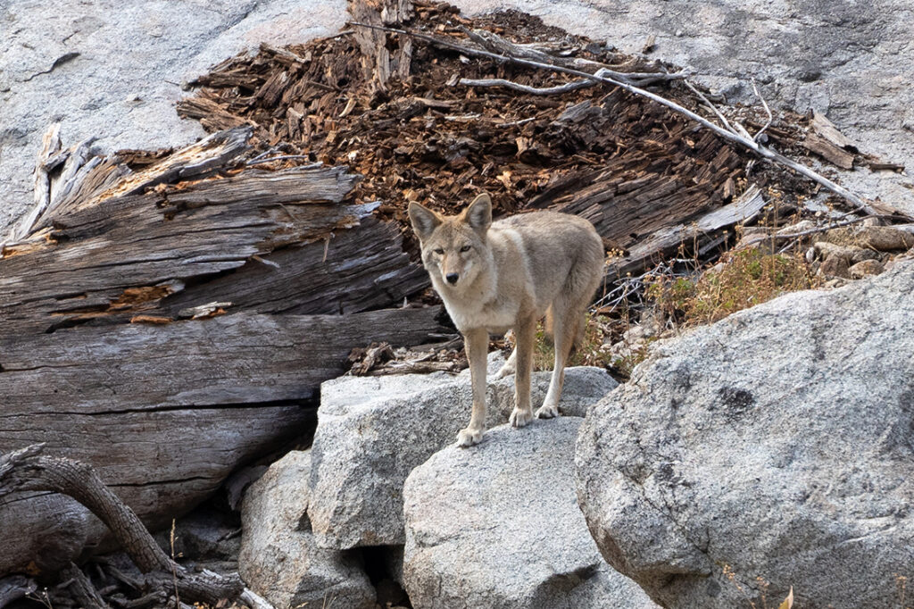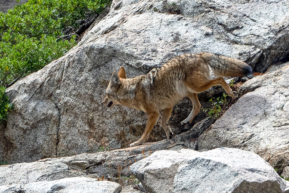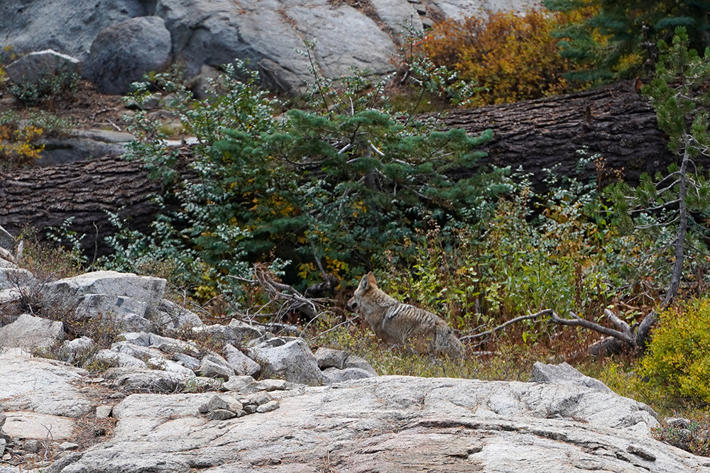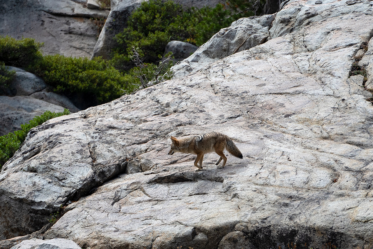 Yesterday on a walk near Lake Tahoe (around where Alpine Meadows meets the Granite Chief Wilderness), I came across two coyotes. I saw the first about 100 meters away, trotting over the granite. Without much evidence, I’ll describe her as a female (see the notes). She paused to look at me…