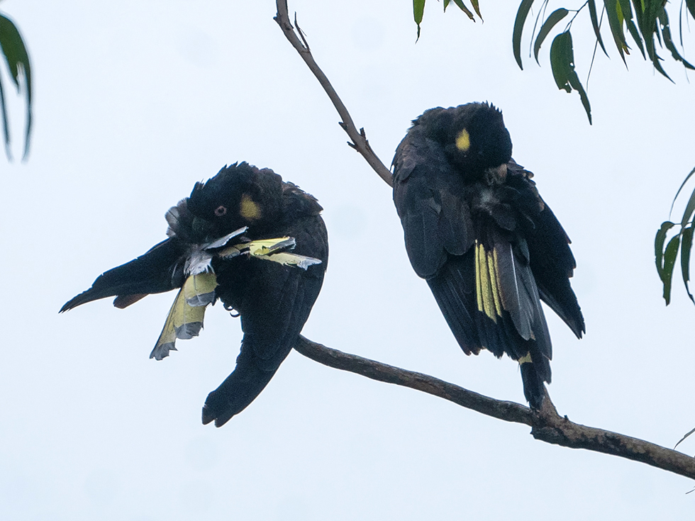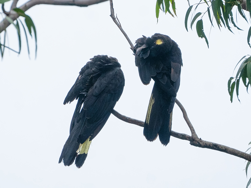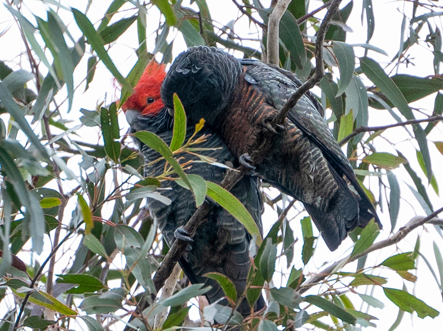 An impression I’ve been getting more and more from various species of cockatoos (Gang-gangs, Glossy Black, Rose-breasted…) is that pairs of these birds seem to like each other a lot – they like being close, like nudging and poking and messing around, more than seems necessary even for a mating pair. I have a planned post from a few months ago with some photos of Gang-gangs who seemed to enjoy each other’s company very much. This was during a colder time, and shared warmth might have been part of it. Here is a photo: